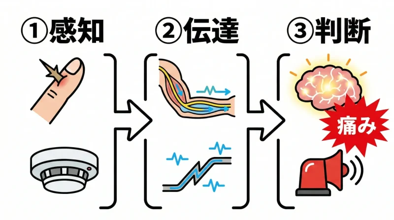 痛みは患部で発生するのではありません。受容器(センサー)が感知した刺激が、末梢神経(電線)を通って脳に届き、脳が「危険だ」と解釈して初めて発生する「出力」です。