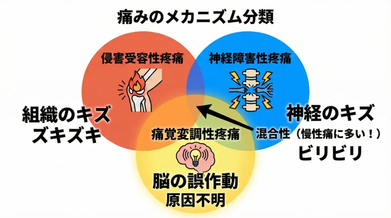 長引く痛みの多くはこれらが複雑に絡み合った「混合性疼痛」です。