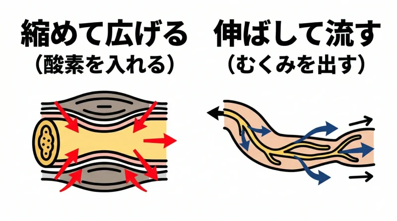 神経の圧迫が疑われる位置の筋肉(筋膜)を縮めることで、神経の通り道を物理的に広げます。それにより新鮮な動脈血が流れ込み、酸欠が解消されます。 - 伸ばして流す